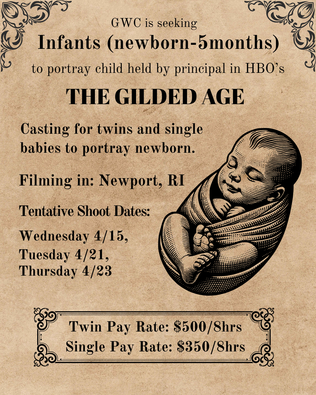Email your name, if you are a SAG-AFTRA member in good standing or not, phone, email, height, weight, clothing and shoe sizes, and current photos to gildedage@gwcnyc.com. Write "Newport Local" in the subject line of your email. Minors must be submitted by parent or guardian and should include age and date of birth in submission.